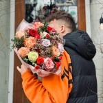 „Bukiet Marzenie” to harmonijna kompozycja trzech kolorów róż, goździków i unikalnych dodatków florystycznych, ozdobiona kolorowym papierem florystycznym.