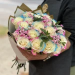 Bukiet "Pastelowy Zachwyt" przyciąga uwagę swoją delikatnością i harmonią kolorów. Składający się z kremowych róż z kolorowymi końcówkami, tworzy piękny kontrast z różowymi dodatkami. Zielone liście i eleganckie opakowanie w jasnych kolorach dopełniają kompozycję, nadając jej lekkości i wyrafinowania.